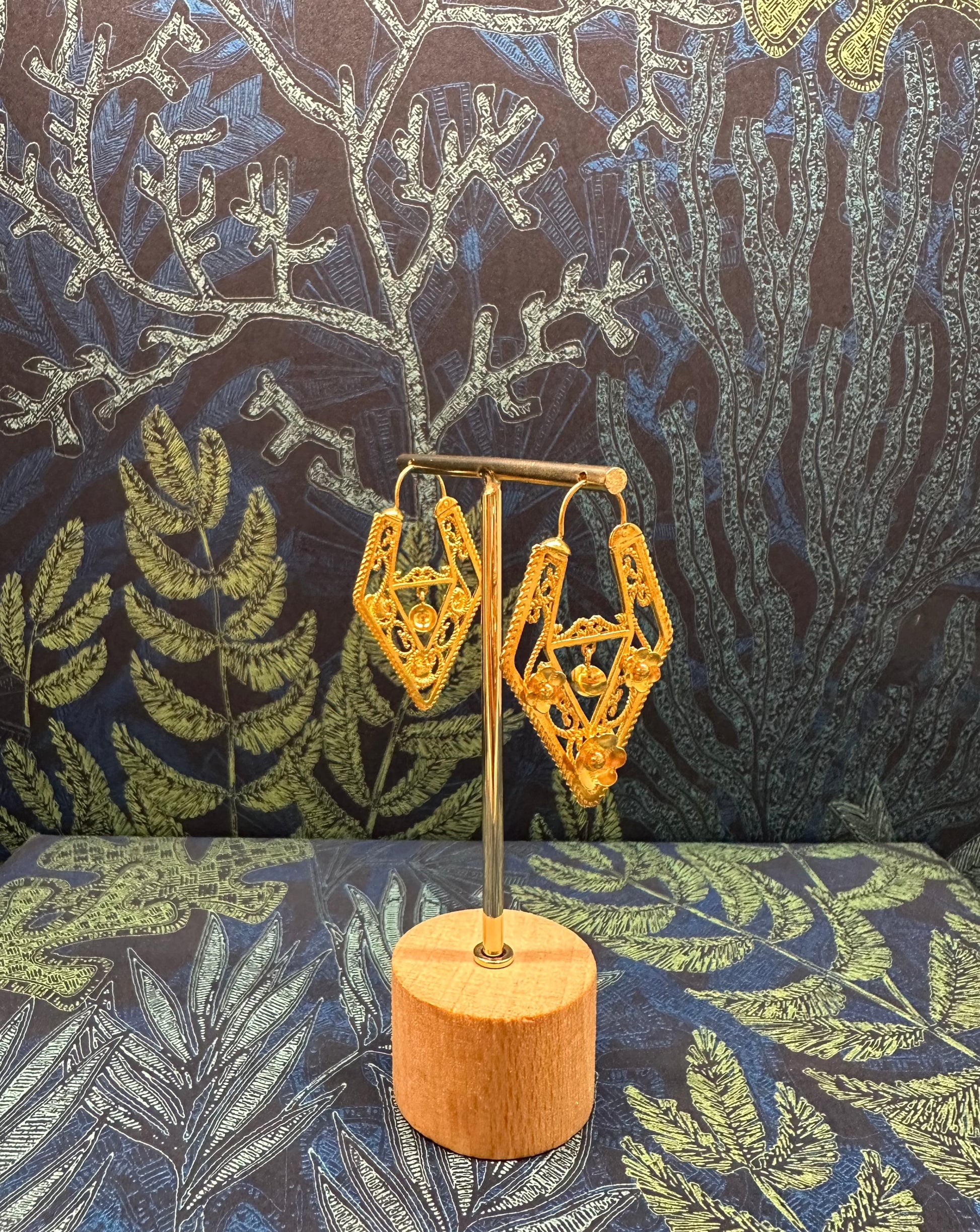 Pendientes de plata con un lujoso baño de oro de 18k en rombo de filigrana ibicenco. Tienen una longitud de 4cm.